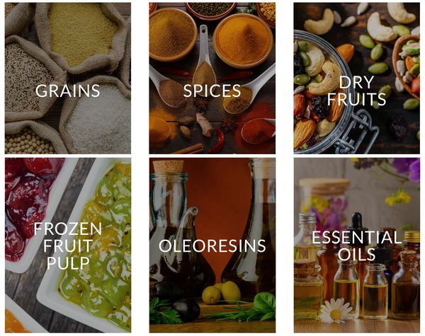 Grains, Spices, Dry Fruits, Fruit Pulps, Oleoresins, Essential Oils